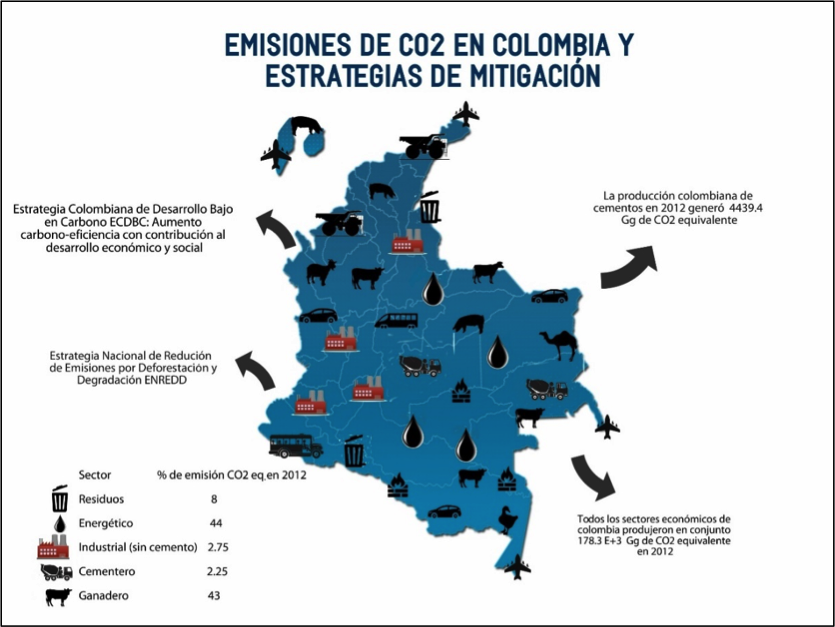 Colombia participa en las emisiones de GEI con alrededor de 0,4% de las emisiones globales. La Figura 1 presenta las contribuciones sectoriales a las emisiones nacionales de CO2. El sector cementero, por sí solo, iguala las emisiones de todo el sector industrial. Se han venido estableciendo acuerdos ambientales entre los países, tales como el protocolo de Kioto, que entró en rigor en 2005 y cuyo principio fue el de crear medidas para mitigar el cambio climático, y más recientemente, el acuerdo de la conferencia de las partes de París en 2015 – COP 22 – con base en un escenario proyectado a 2030[1]. Las acciones nacionales de mitigación se enfocan a la reducción de la deforestación y degradación y al aumento en la eficiencia de carbono asociado a la eficiencia energética. Adicionalmente, se ha incluido la captura y almacenamiento de carbono dentro del portafolio de las estrategias de “eficiencia”, sin embargo no se ha considerado dentro de las políticas la transformación de CO2 capturado en productos con alto valor agregado.
