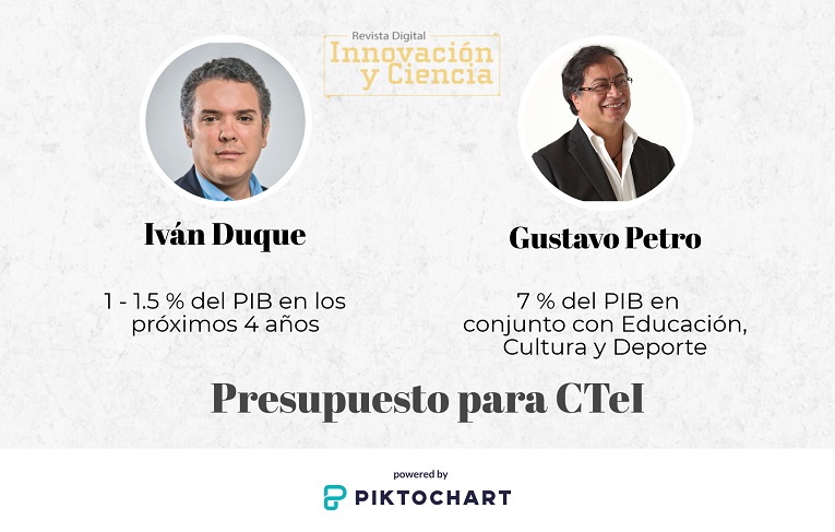 Los dos candidatos hablan de un aumento para el presupuesto que se destinaría a CTeI, que en la actualidad está cerca del 0,2 % del PIB nacional. Iván Duque propone un aumento en los próximos cuatro años a 1 o 1.5 % del PIB, mientras que Gustavo Petro propone un aumento al 7 % compartido con educación, cultura y deporte.