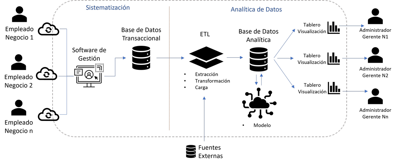Para analizar esta problemática es necesario mencionar sus posibles causas. Una de ellas es la falta de estrategias y acompañamiento en la transición digital y tecnológica que tienen este tipo de negocios, desconocimiento que ocasiona resistencia al cambio, así como también, la falta de objetivos concretos definidos en el modelo de negocio. Otros aspectos, no menos importantes, son la carencia de sistematización que los incapacita para realizar la captura y el almacenamiento adecuado de los datos como insumo principal para desarrollar análisis de la información y/o poder predecir la demanda de clientes, derivando en la prestación de un servicio deficiente a sus visitantes. Así mismo, la reducción de la rentabilidad por la inexistencia de procesos de estandarización para la producción y preparación de alimentos y el aumento de costos por el deficiente control de gastos e inventario en su operación diaria, son otros aspectos importantes que contribuyen a la problemática planteada. Por lo anterior, se determinó diseñar una solución de base tecnológica compuesta por un sistema de software para facilitar la captura y almacenamiento de datos estructurados, también se incluyeron componentes de analítica avanzada para la explotación de la información.