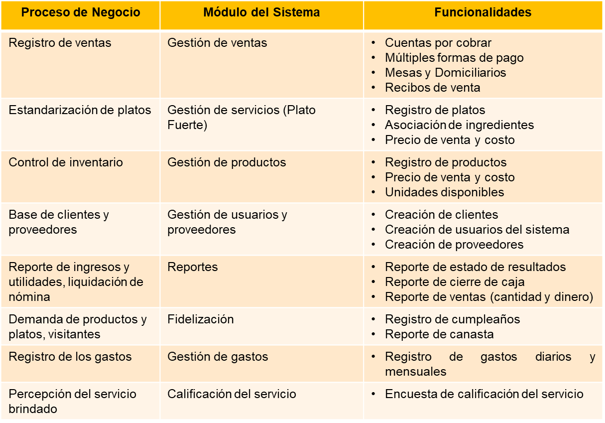 Para la sistematización se identificaron los siguientes procesos críticos de negocio que permitieron caracterizar los módulos y funcionalidades del sistema que se desarrollaron como producto mínimo viable en el software.